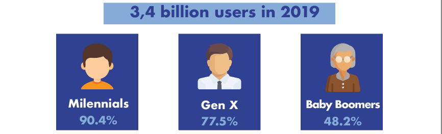 In 2019, there were 3.4 billion users of social media. 90.4% of Millennials use social networks, Gen X are 77.5% and only 48.2% of Baby Boomers use social networks.